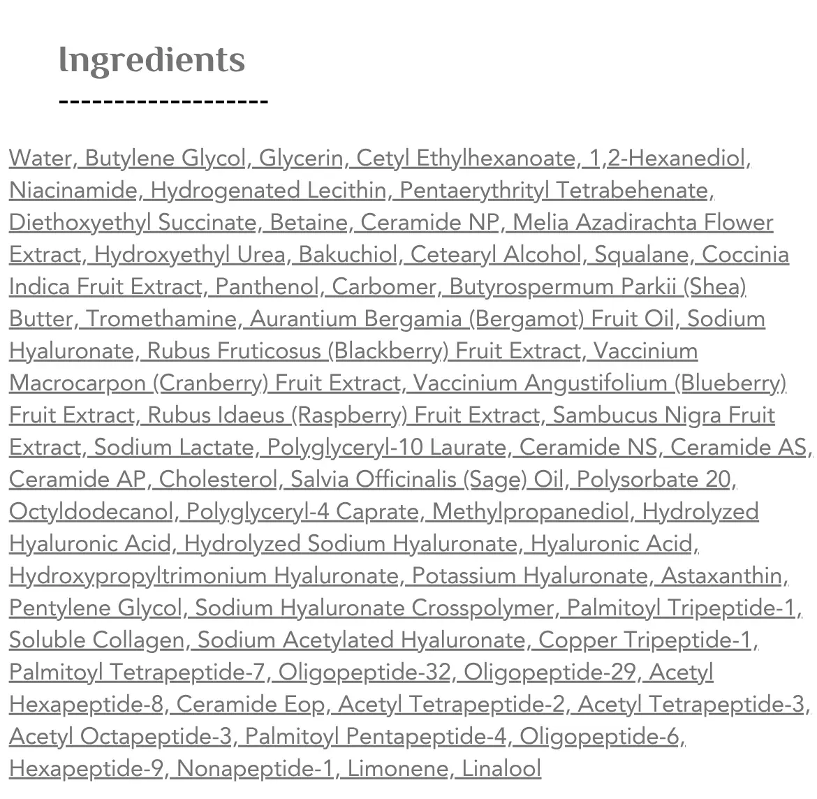 تركيبة مبتكرة تعمل على تحفيز الكولاجين وتجديد خلايا البشرة بفعالية، لتمنحك بشرة مشدودة وناعمة ومليئة بالحيوية. مثالي لمن تبحث عن نتائج شبيهة بالريتينول لكن بطريقة طبيعية ولطيفة على البشرة.
